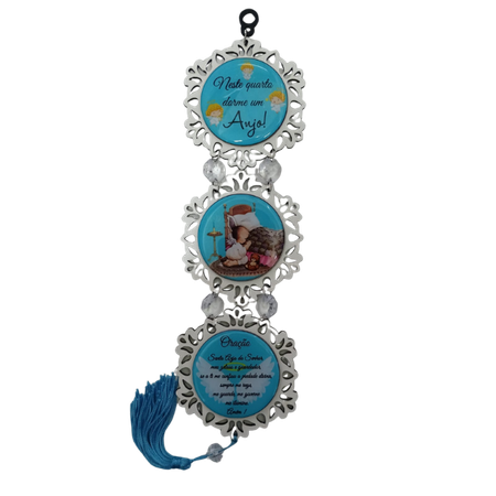 O adorno tem estrutura em MDF com acabamento em azul, apresentando três círculos decorativos unidos por pequenos elementos transparentes. Cada círculo contém uma ilustração ou texto relacionados ao anjo da guarda, incluindo orações e mensagens para proteção do bebê. O enfeite possui um tassel azul na ponta para um detalhe delicado.
