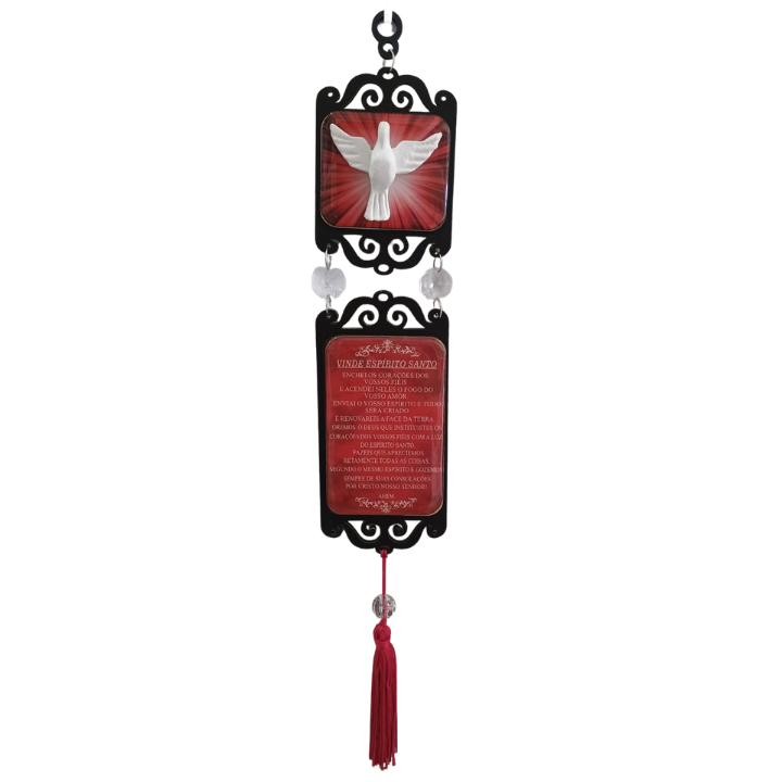 Este adorno duplo apresenta uma peça superior com a representação em relevo do Espírito Santo em branco, sobre fundo vermelho luminoso. A peça inferior traz uma oração dedicada ao Espírito Santo, em fundo vermelho com texto branco, ambos emoldurados por detalhes pretos em MDF com desenhos ornamentais. O conjunto é unido por cristais translúcidos, além de um pingente com tassel vermelho na base, conferindo movimento e elegância.