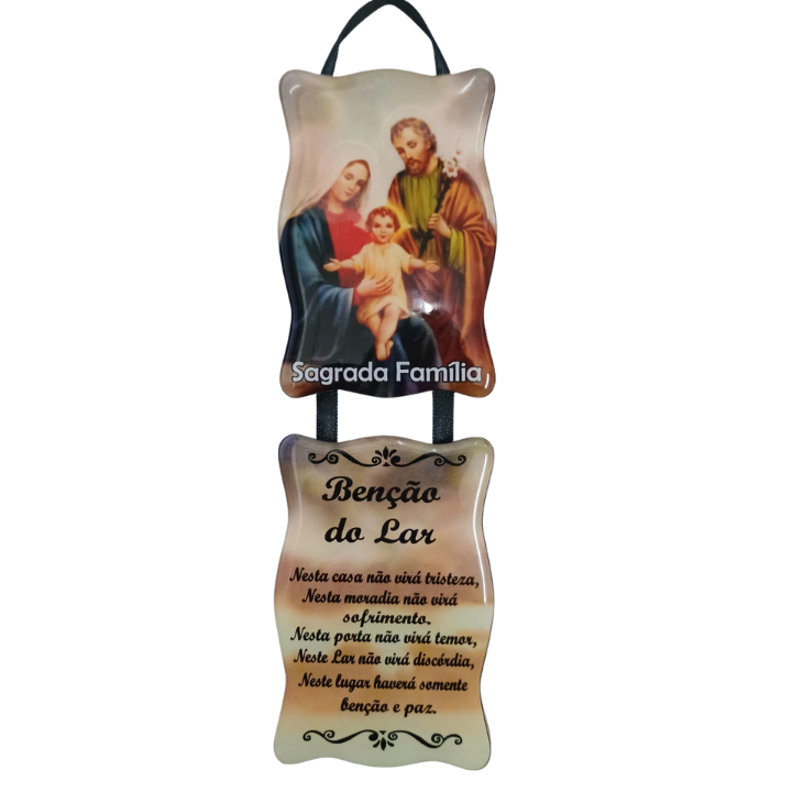 O produto apresenta um acabamento que destaca as imagens tradicionais da Sagrada Família e uma mensagem escrita abaixo desejando bênçãos, paz e harmonia no lar. Ideal para quem busca um adorno com significado religioso e charmosa apresentação para ambientes internos.