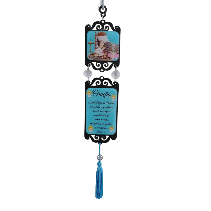 O produto é confeccionado em MDF com elemento decorativo em cristal e acabamento em tassel na cor azul, perfeito para pendurar em paredes ou portas do quarto do bebê. É uma peça delicada que une religiosidade e beleza para o espaço infantil.