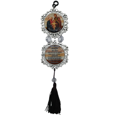 Pode ser pendurado facilmente em paredes, portas ou altares Esse adorno apresenta acabamento simples e prático, ideal para ambientes pequenos ou como complemento decorativo. As imagens da Sagrada Família mostram Jesus, Maria e José em posição tradicional, fortalecendo o simbolismo religioso. Em um dos círculos, há uma oração com bênção para proteção do lar. O produto conta ainda com cristais decorativos e um tassel na parte inferior para um toque artesanal.