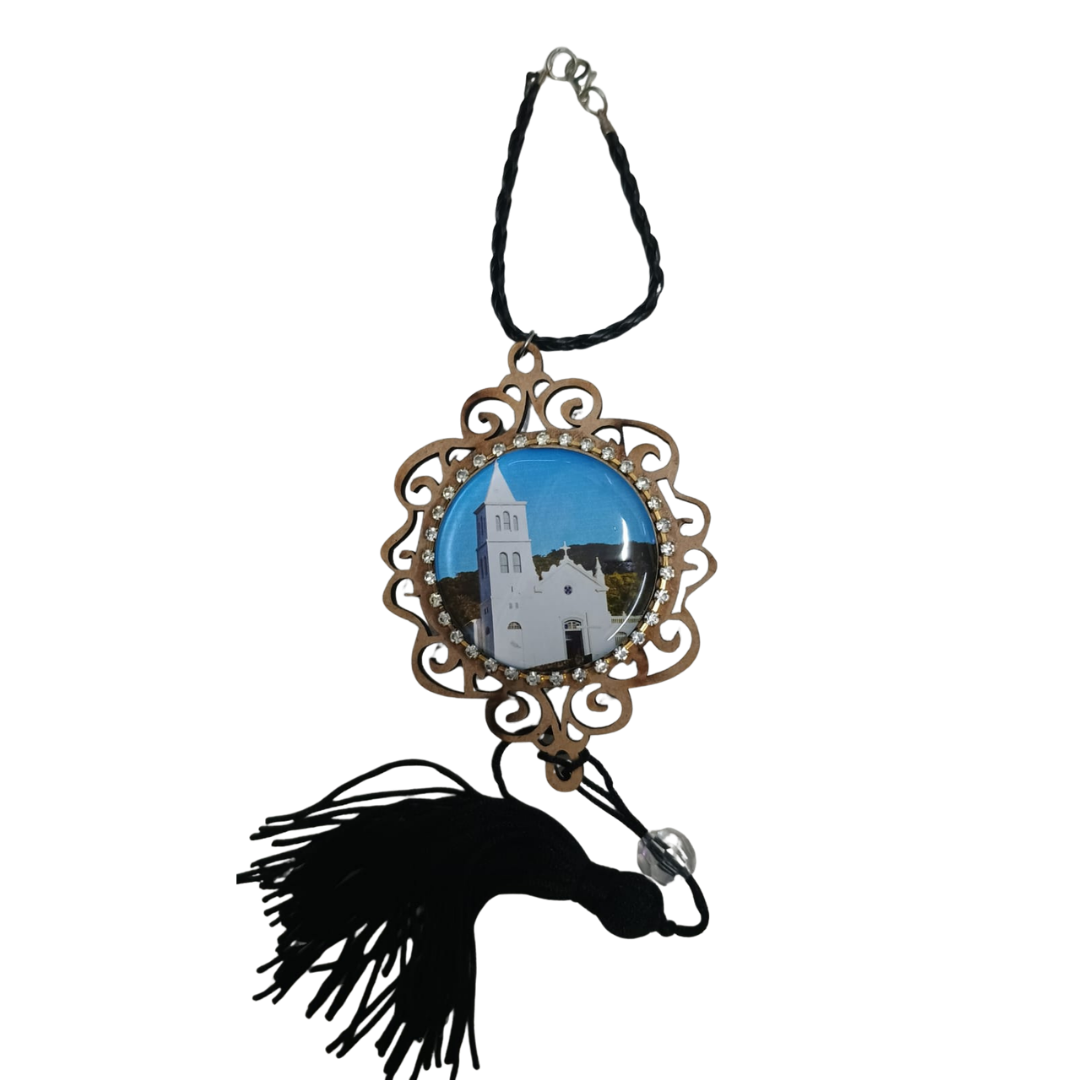 - Possui tassel para acabamento elegante O adorno traz no centro uma imagem de São Joaquim e outra da igreja, ambas produzidas em resina com acabamento. A base em MDF tem recortes decorativos que valorizam o produto, que conta com um cordão para pendurar e um tassel preto para decorar. Ideal para quem deseja um acessório simples e significativo para o carro.