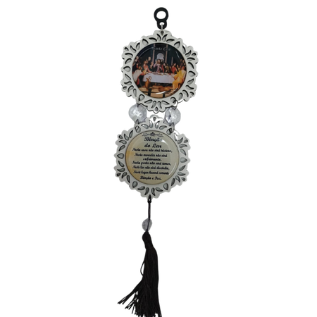 O adorno apresenta duas placas redondas, a superior com a imagem tradicional da Santa Ceia e a inferior com uma oração ou bênção, unidas por cristais decorativos e finalizadas com uma franja de fios pretos. É confeccionado em MDF, um material leve, ideal para decoração interna.