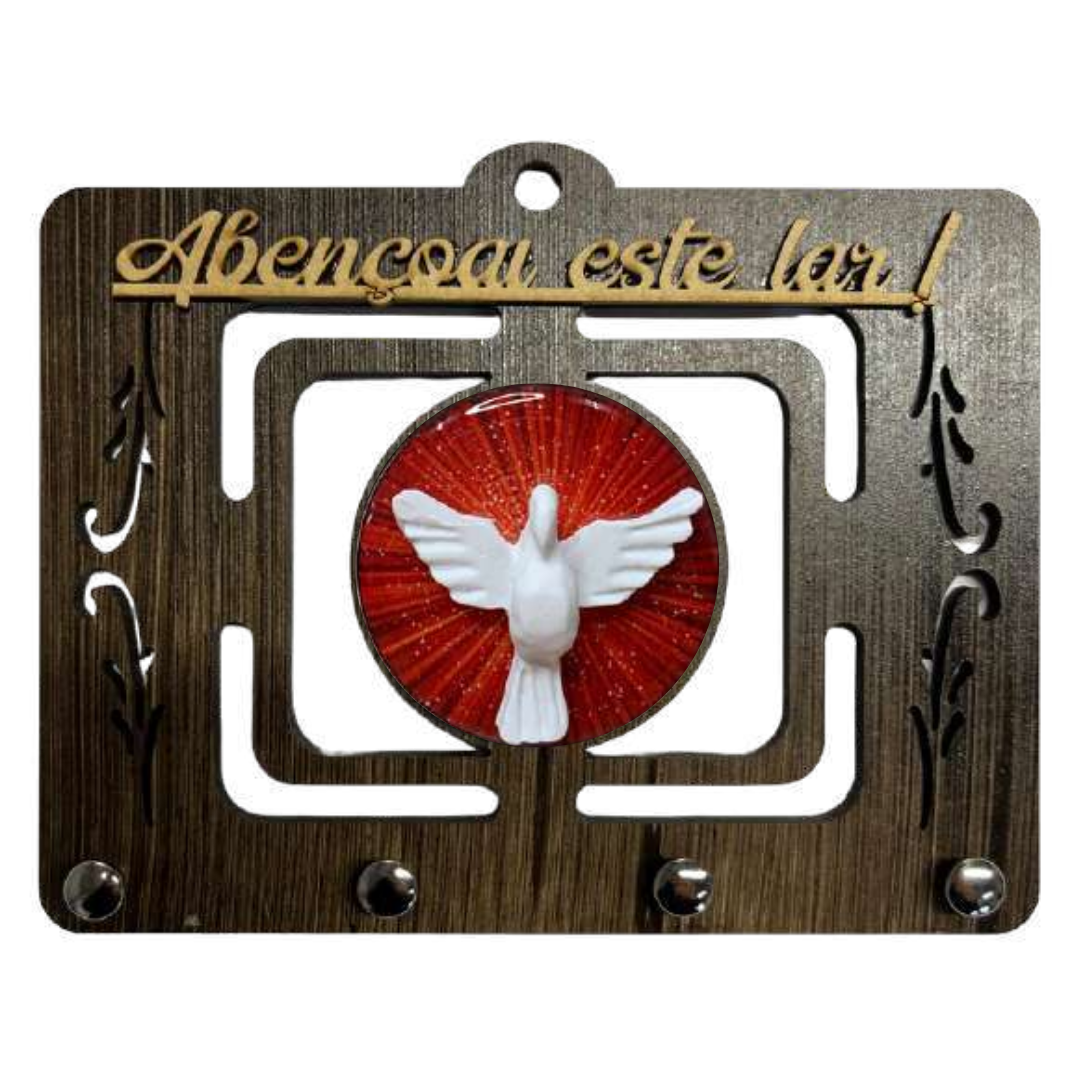 O porta chave é feito em material resinado que imita madeira na cor tabaco, garantindo maior resistência a riscos e desgaste diário. Possui gancho para pendurar na parede e quatro suportes metálicos para chaves. O destaque fica para a peça central do Divino Espírito Santo, entregue em acabamento detalhado e resistente.