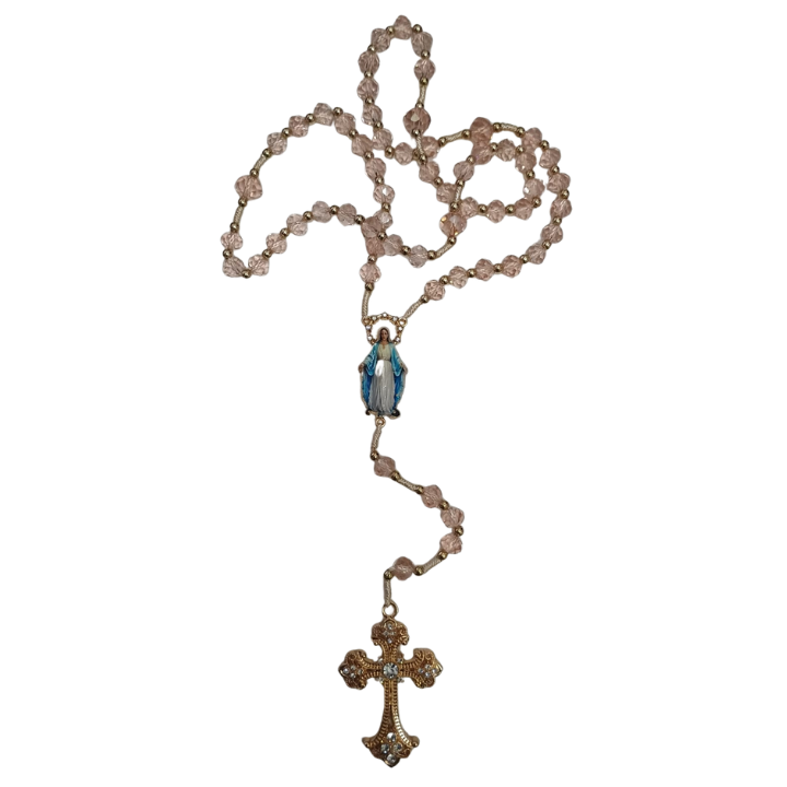 Ideal para uso pessoal ou como presente religioso com significado profundo Este terço apresenta contas facetadas em cristal rosado interligadas por fios resistentes. A medalha da Virgem possui pintura fina, com destaque para as cores tradicionais da imagem. A cruz dourada tem acabamento sofisticado e detalhes em pequenas pedras que refletem a luz, valorizando seu uso durante as orações.