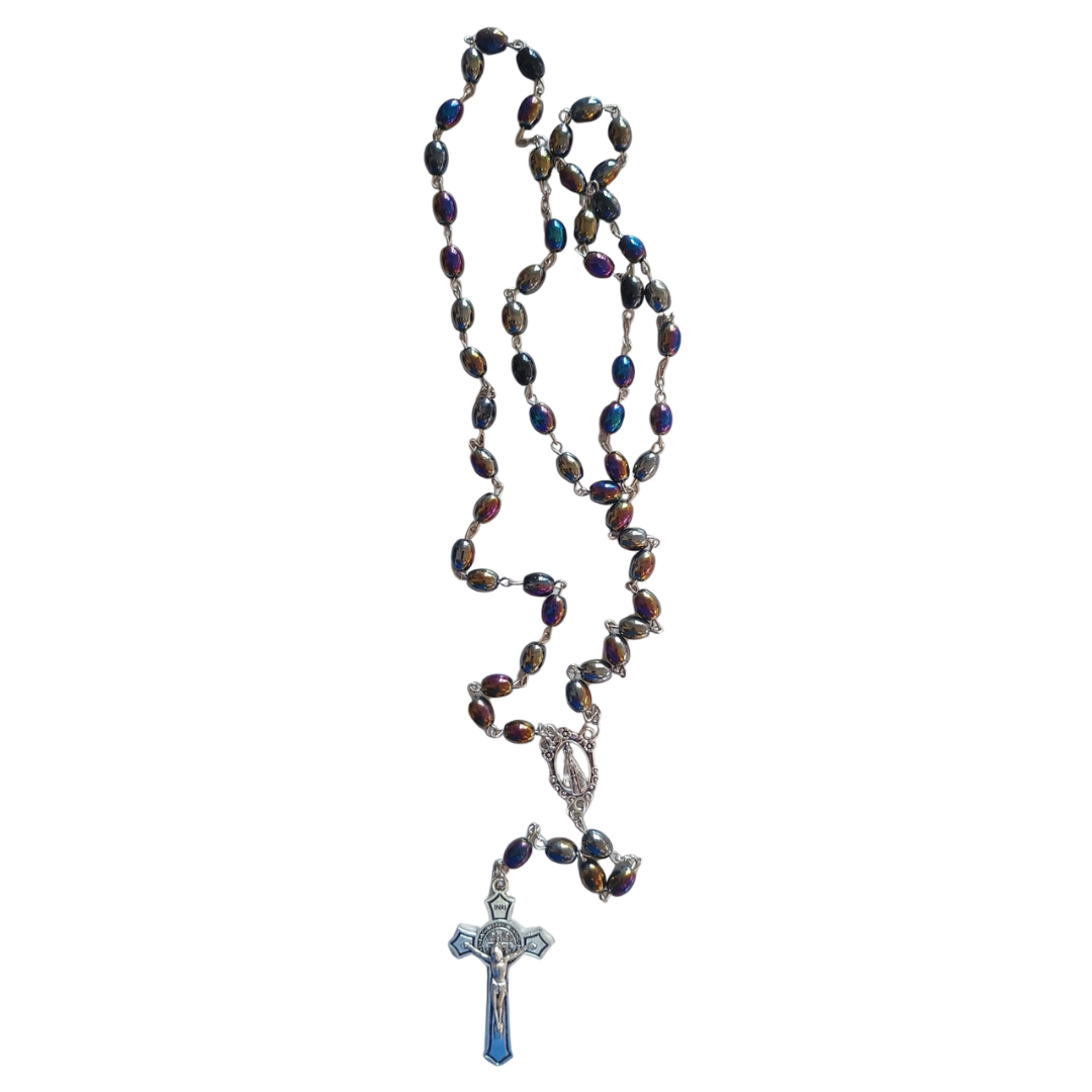 Um terço tradicional com contas em vidro multicolor, ideal para orações e devoções dedicadas a Nossa Senhora Aparecida.