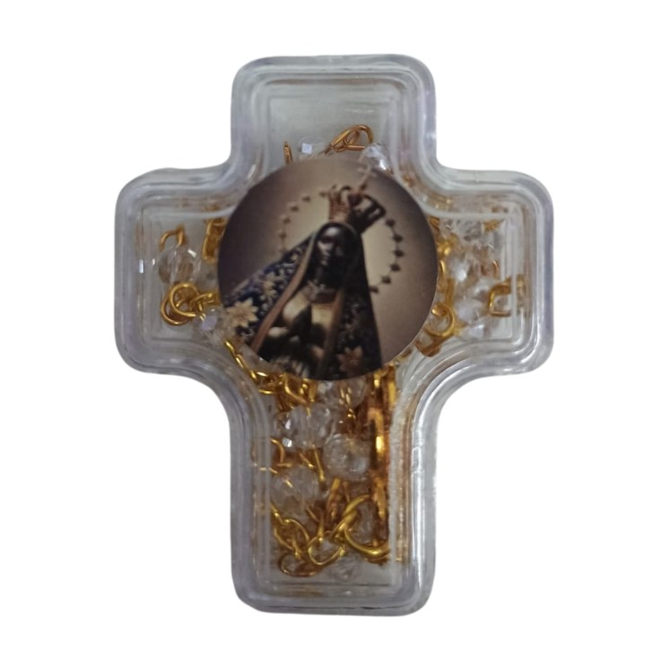 Esse terço de NS Aparecida traz um design delicado e funcional, ideal para orar com estilo e fé. Ele vem com miçangas trasnlucida e acabamento dourado, além de conter uma caixinha em formato de cruz para guardar o terço com segurança.